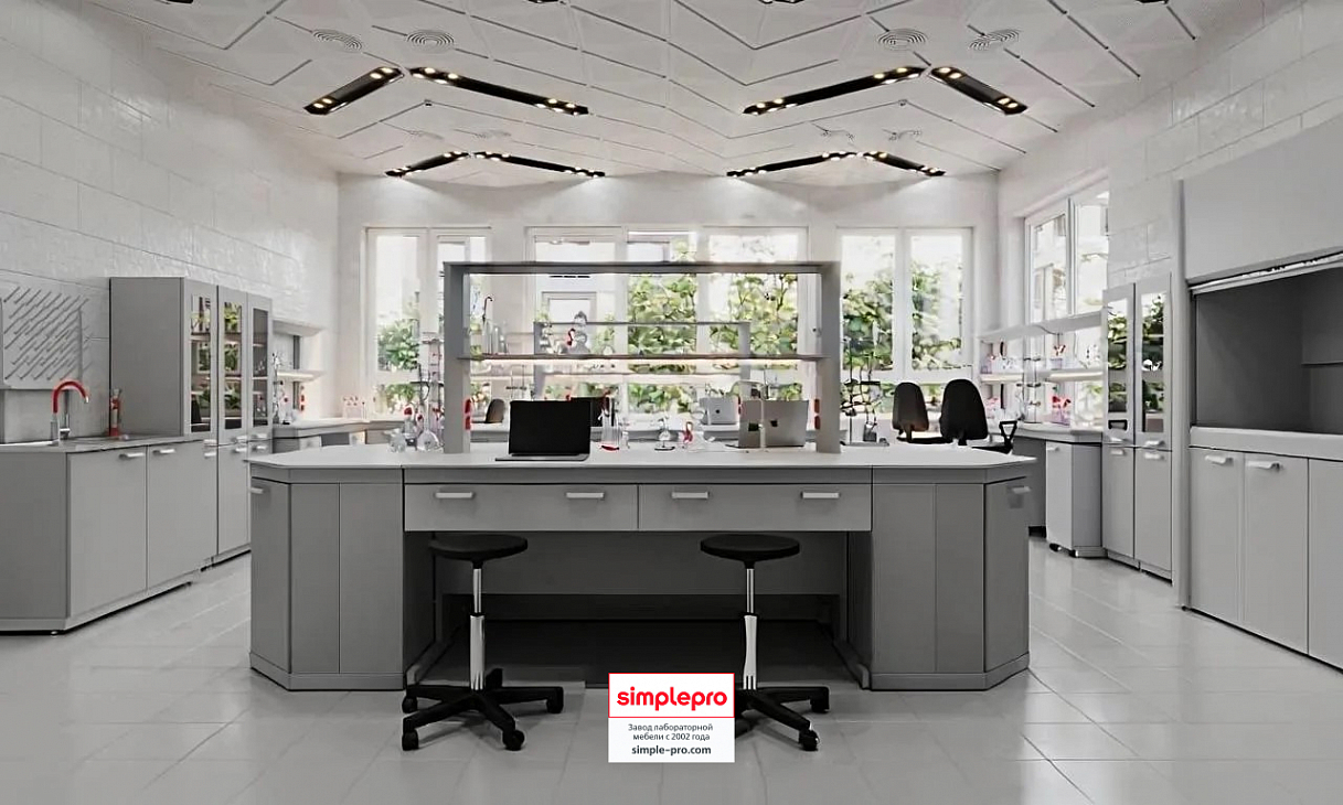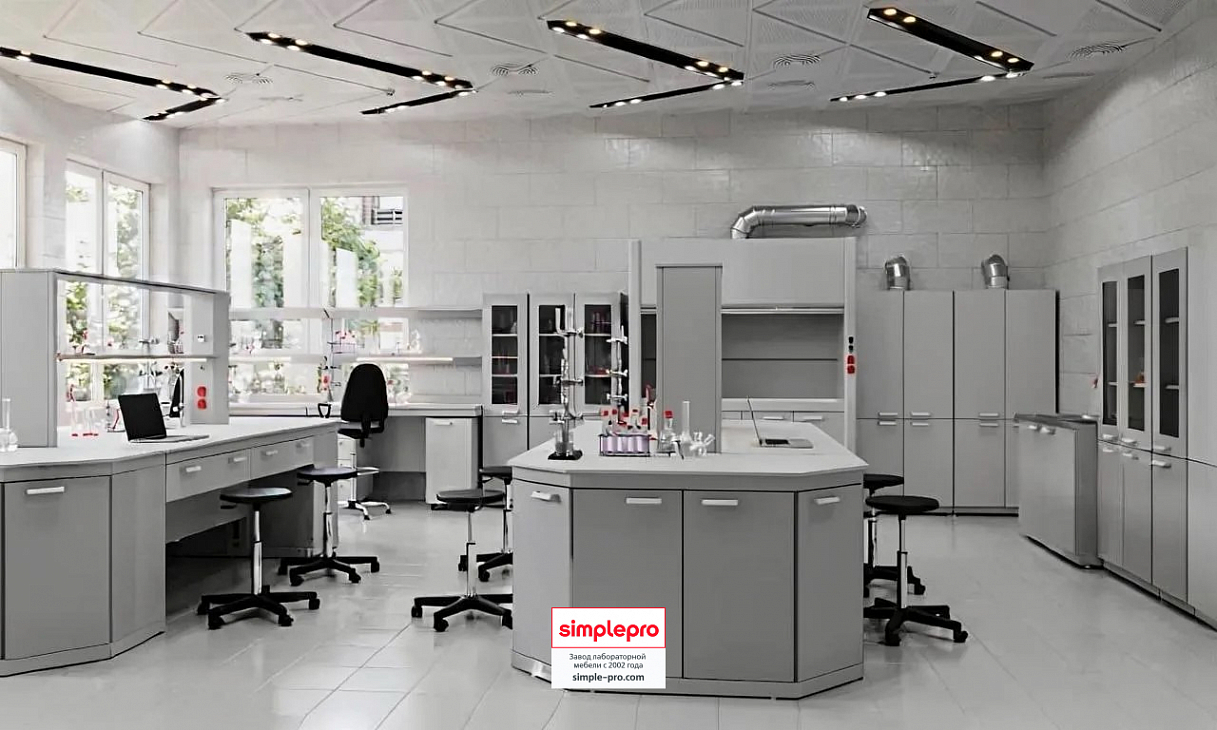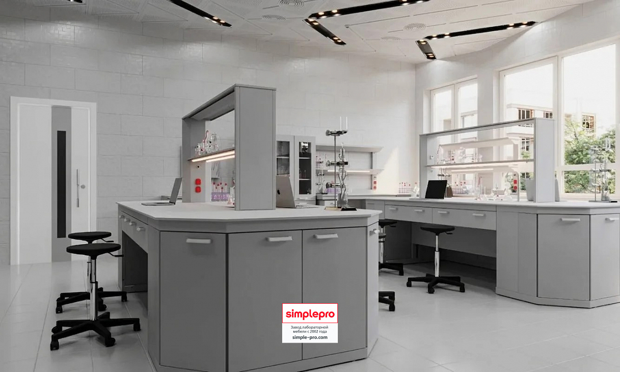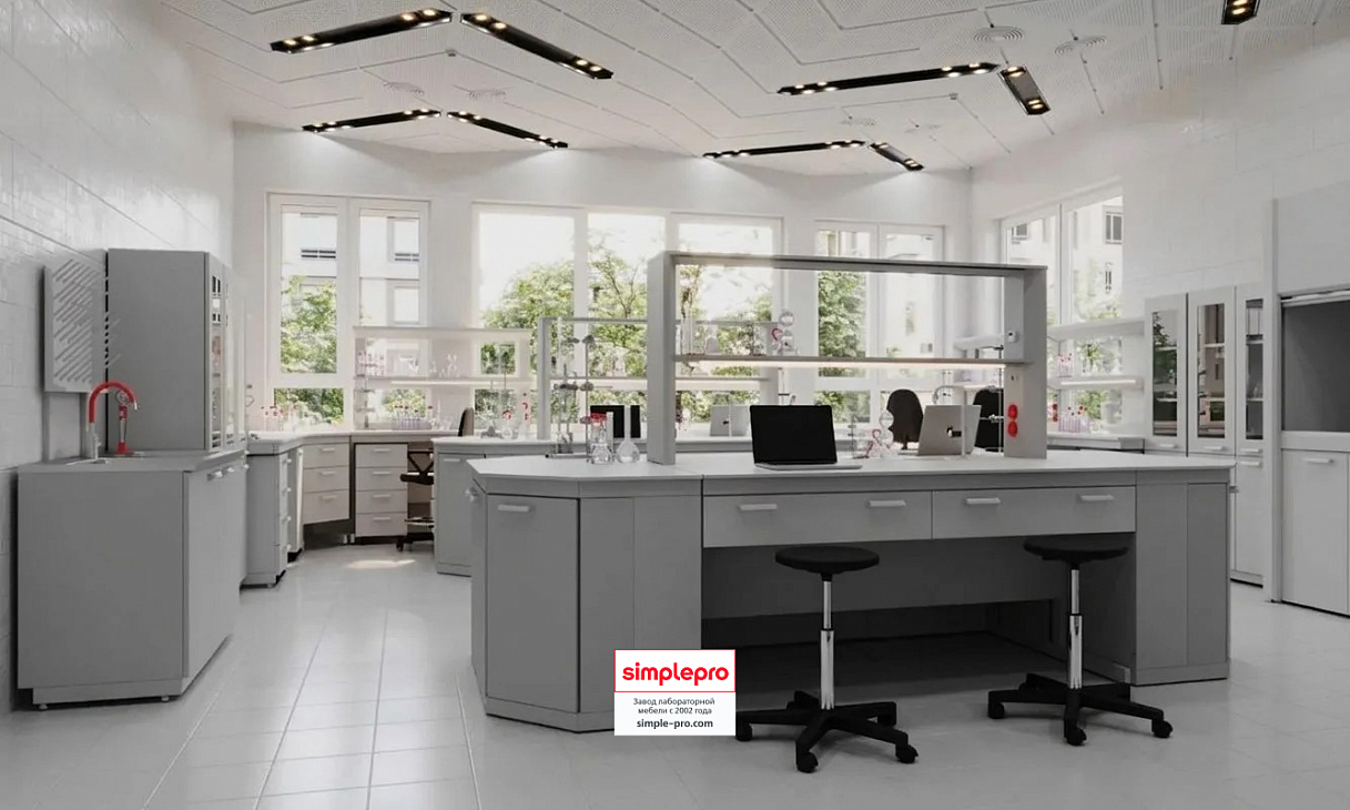 При покупке лабораторной мебели нужно учесть выводы для подключения воды, электричества, вытяжной вентиляции. Эргономично расставить вытяжные шкафы и островные столы.