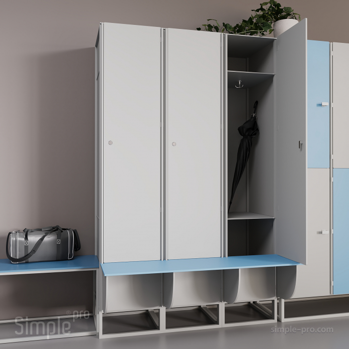 В каталоге российской компании Simple PRO можно найти разные решения для оснащения раздевалок, и одноярусный шкаф со скамьей – одно из самых востребованных. Шкаф изготавливается из качественного современного пластика и имеет прочный металлический каркас. Такая мебель отличается влагостойкостью, прекрасно выдерживает многократные обработки даже средствами профессиональной химии и прекрасно подходит для разных учреждений.