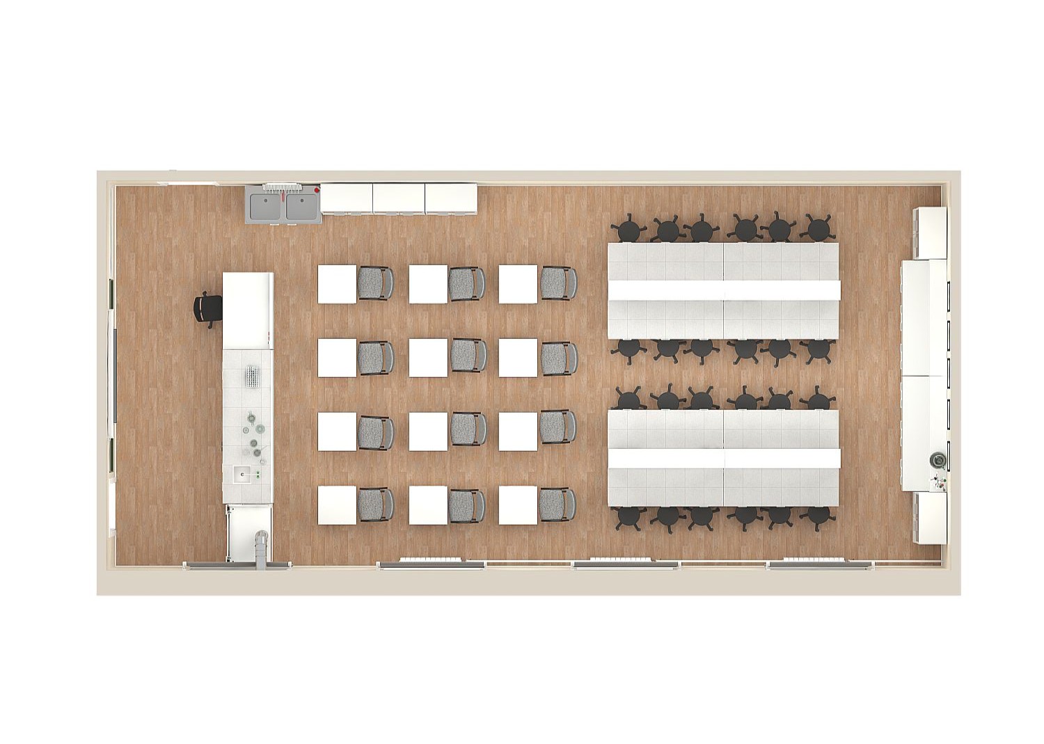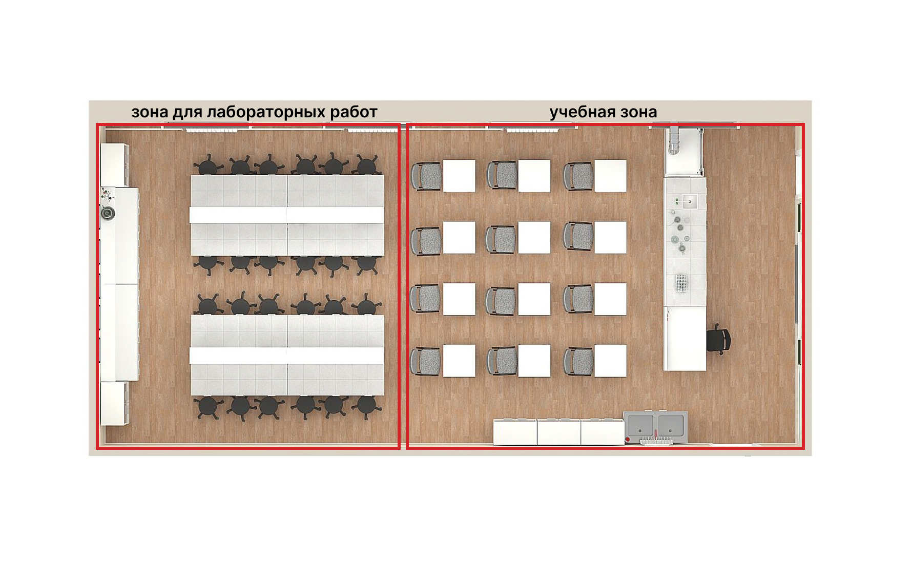 Проект для МАОУ СОШ № 58 демонстрирует трансформацию традиционного школьного кабинета в многофункциональное образовательное пространство. Эргономичное зонирование, предусматривающее разделение на теоретическую и практическую зоны, соответствует принципам педагогического дизайна и способствует повышению эффективности учебного процесса. Лабораторные островные столы, оснащенные необходимыми коммуникациями, позволяют учащимся развивать практические навыки работы с оборудованием, что формирует компетенции, необходимые для дальнейшего обучения в вузах и работы в научной сфере.- Для обеспечения долговечности в условиях интенсивной эксплуатации вся мебель была изготовлена на металлическом каркасе с порошковым покрытием, устойчивым к механическим повреждениям.