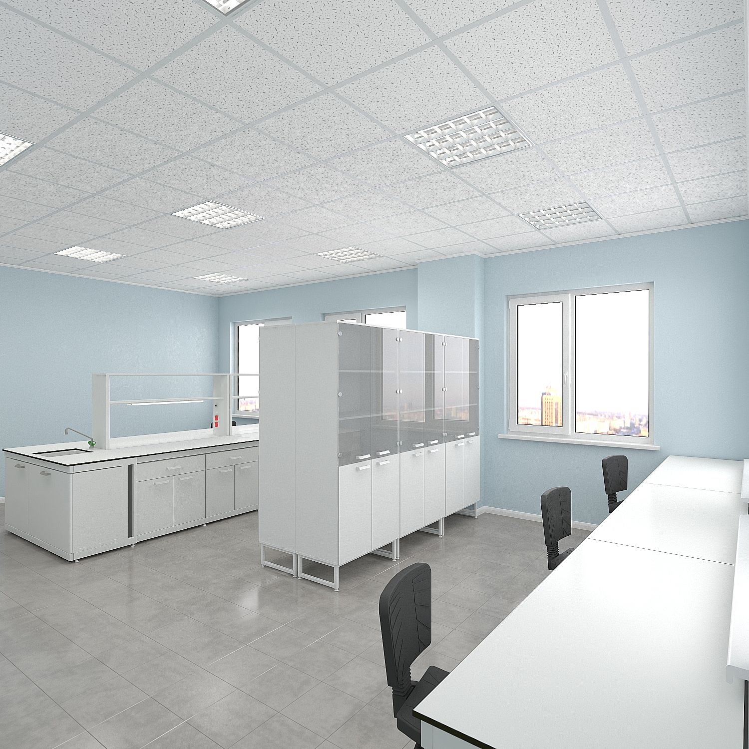 Главная проблема заключалась в планировке: лабораторная и лаборантская зоны располагались в едином помещении без физического разграничения. Лаборантская — это место, где сотрудники оформляют документацию, работают с журналами и протоколами. Лабораторная зона — пространство для работы с реактивами, приборами и пробами. Совмещение этих функций в одном открытом пространстве создавало неудобства: бумажная работа соседствовала с химическими операциями, что противоречило и внутренним регламентам, и здравому смыслу.