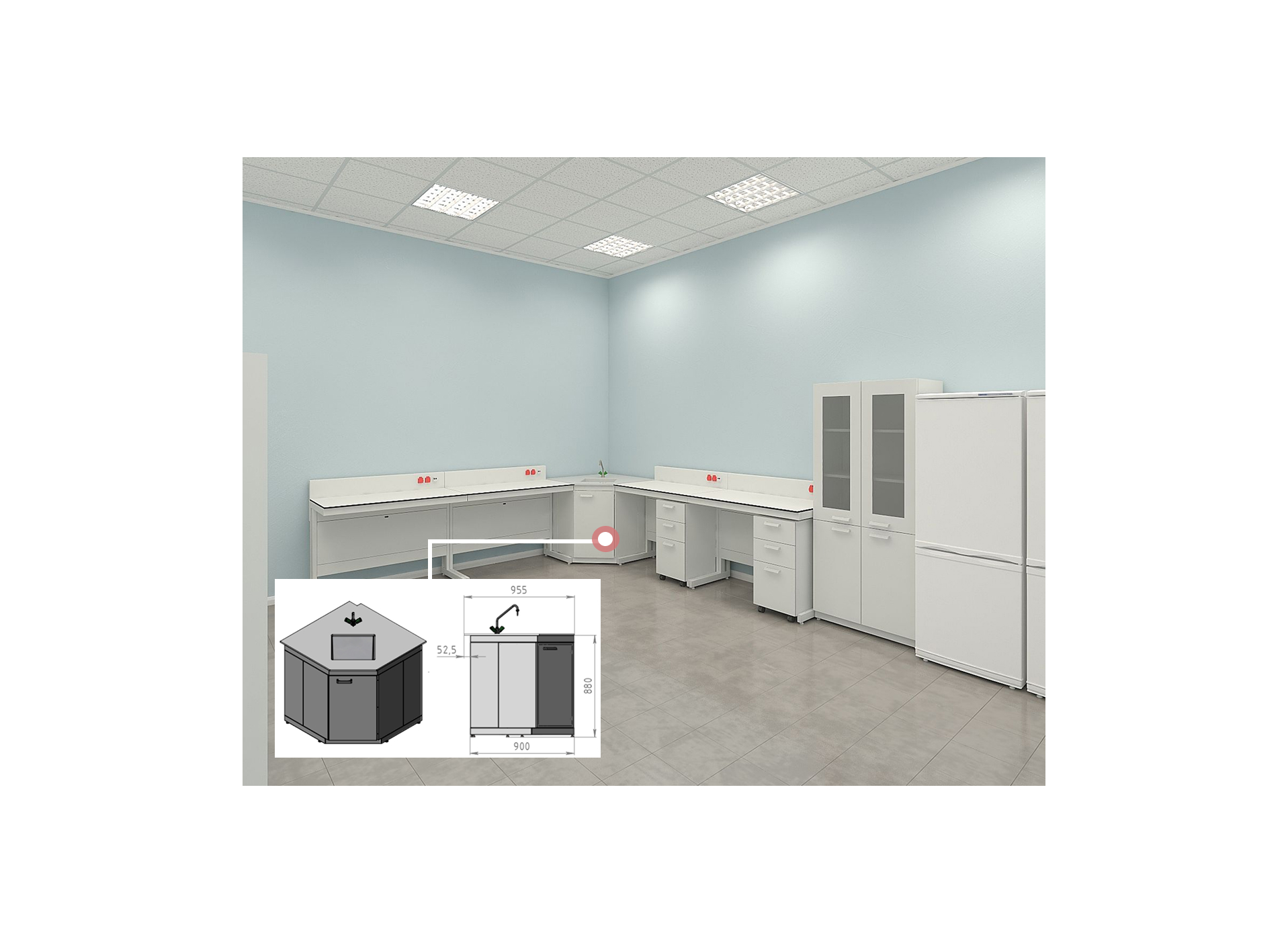 Помимо зонирования, перед заказчиком стояла ещё одна задача: организовать угловую мойку. В 2017 году такого изделия не было в стандартной линейке Simple PRO, поэтому требовалась индивидуальная разработка.