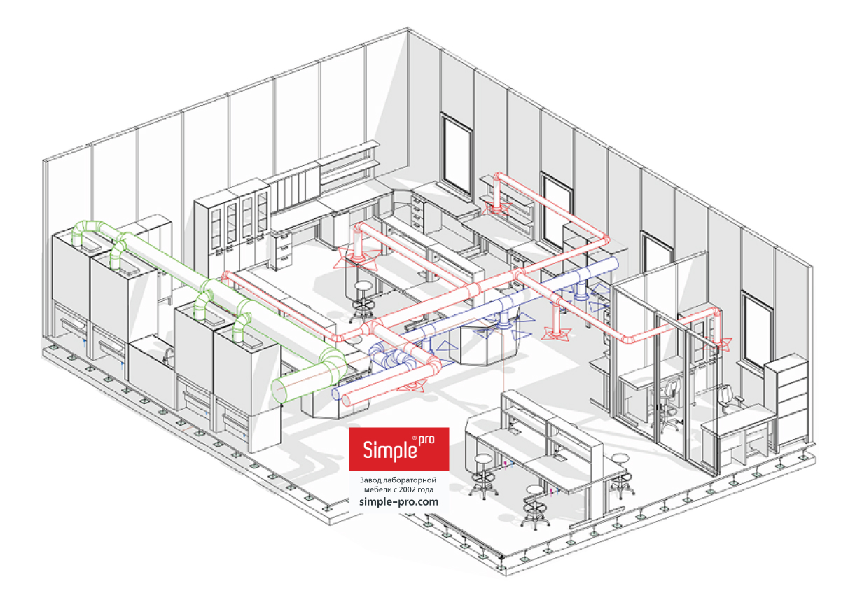 - Модули мебели (столы, шкафы, вытяжные шкафы, мойки, стеллажи) должны подбираться с учетом функциональных потребностей лаборатории.